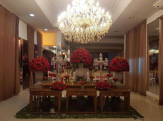 Salão térreo com recepção, lustre grandioso para receber a mesa do bolo, acomoda se muito bem as mesas de convidados, um ambiente dedicado para a pista de dança.